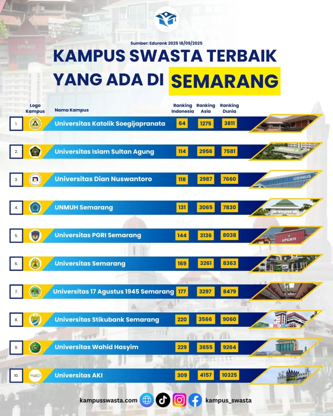 Berdasarkan data EduRank 2025 (18 September 2025), berikut adalah daftar kampus swasta terbaik di Semarang lengkap dengan peringkat nasional, Asia, dan dunia.