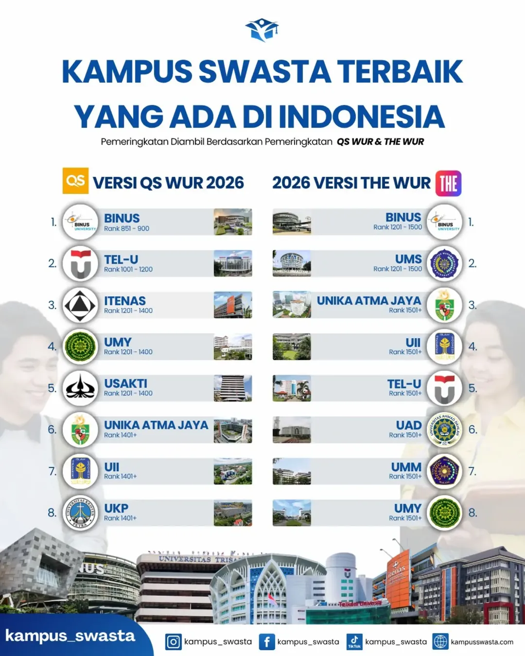 Sementara itu, menurut THE WUR 2026, daftar kampus swasta terbaik di Indonesia adalah: