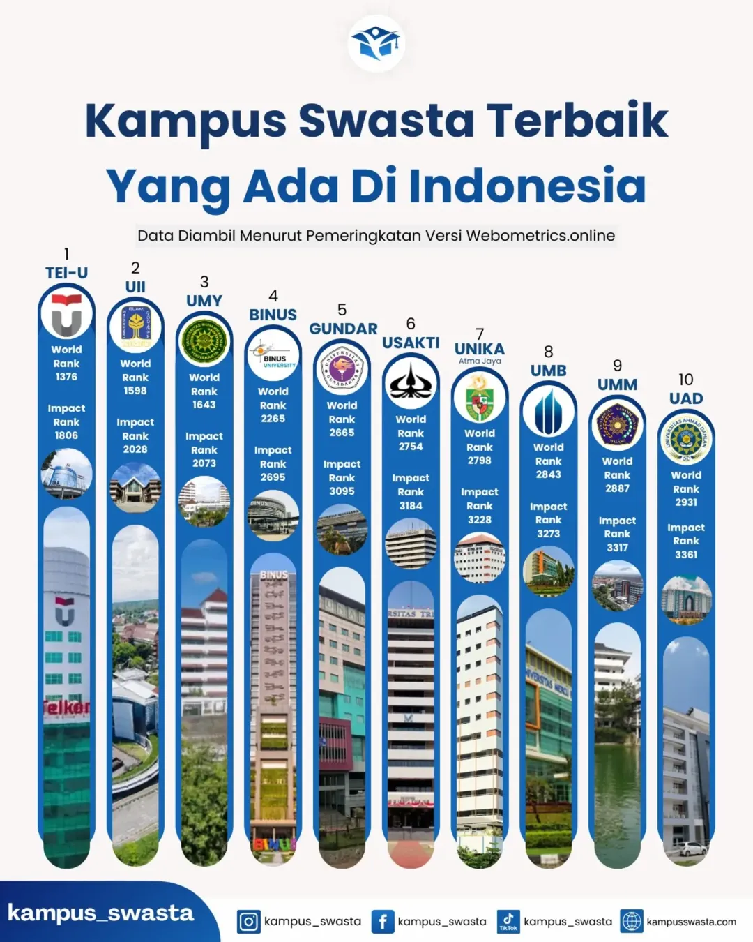 Memilih perguruan tinggi merupakan langkah penting dalam menentukan masa depan. Di Indonesia, selain perguruan tinggi negeri, kampus swasta juga menawarkan kualitas pendidikan yang tidak kalah bersaing. Berdasarkan pemeringkatan dari Webometrics, terdapat sejumlah kampus swasta terbaik di Indonesia yang berhasil menunjukkan kualitasnya di tingkat global.