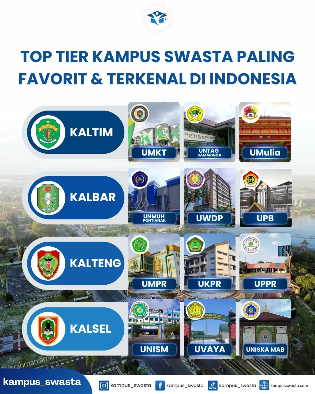 Berikut daftar kampus swasta top tier paling favorit dan terkenal di wilayah Kalimantan berdasarkan kategori provinsi: